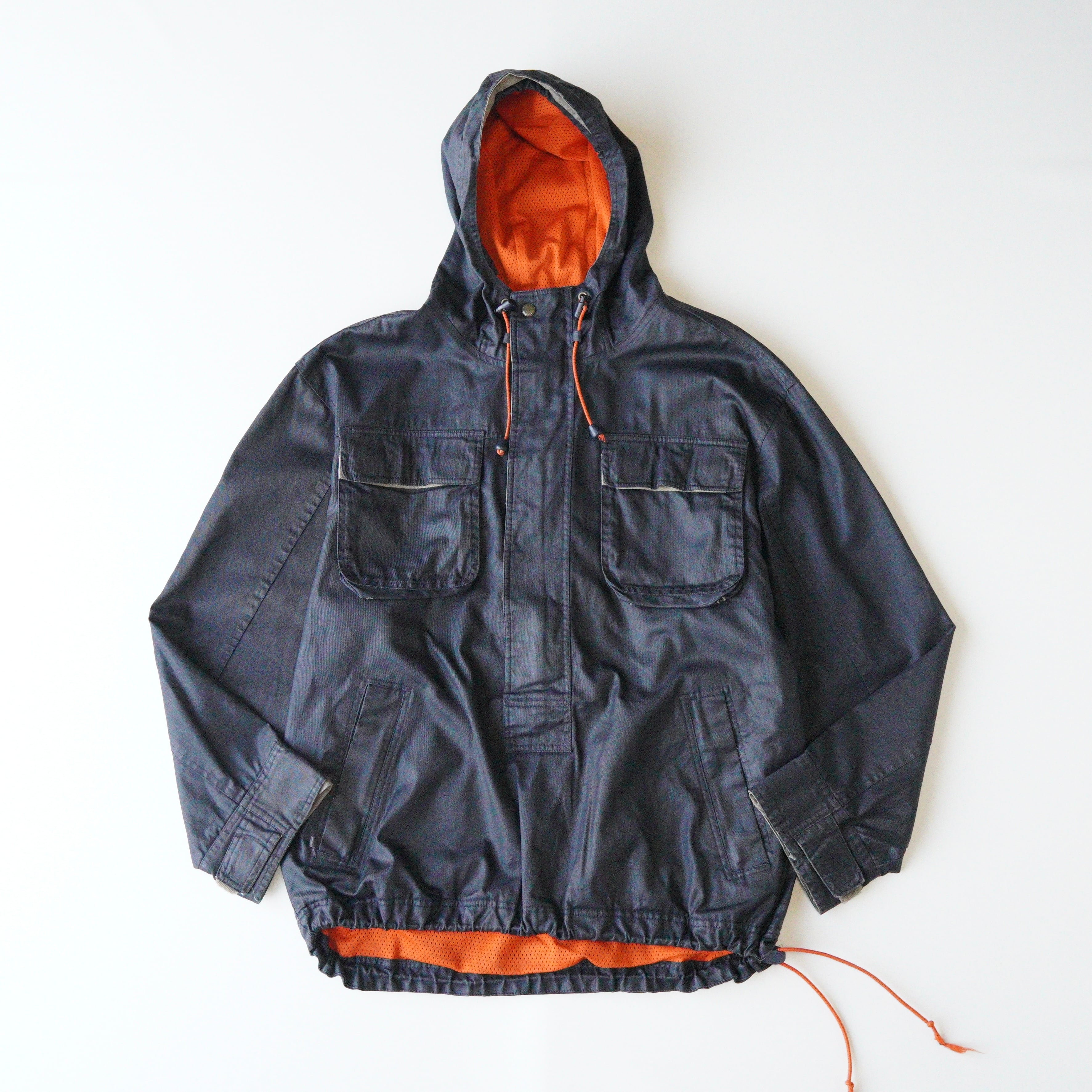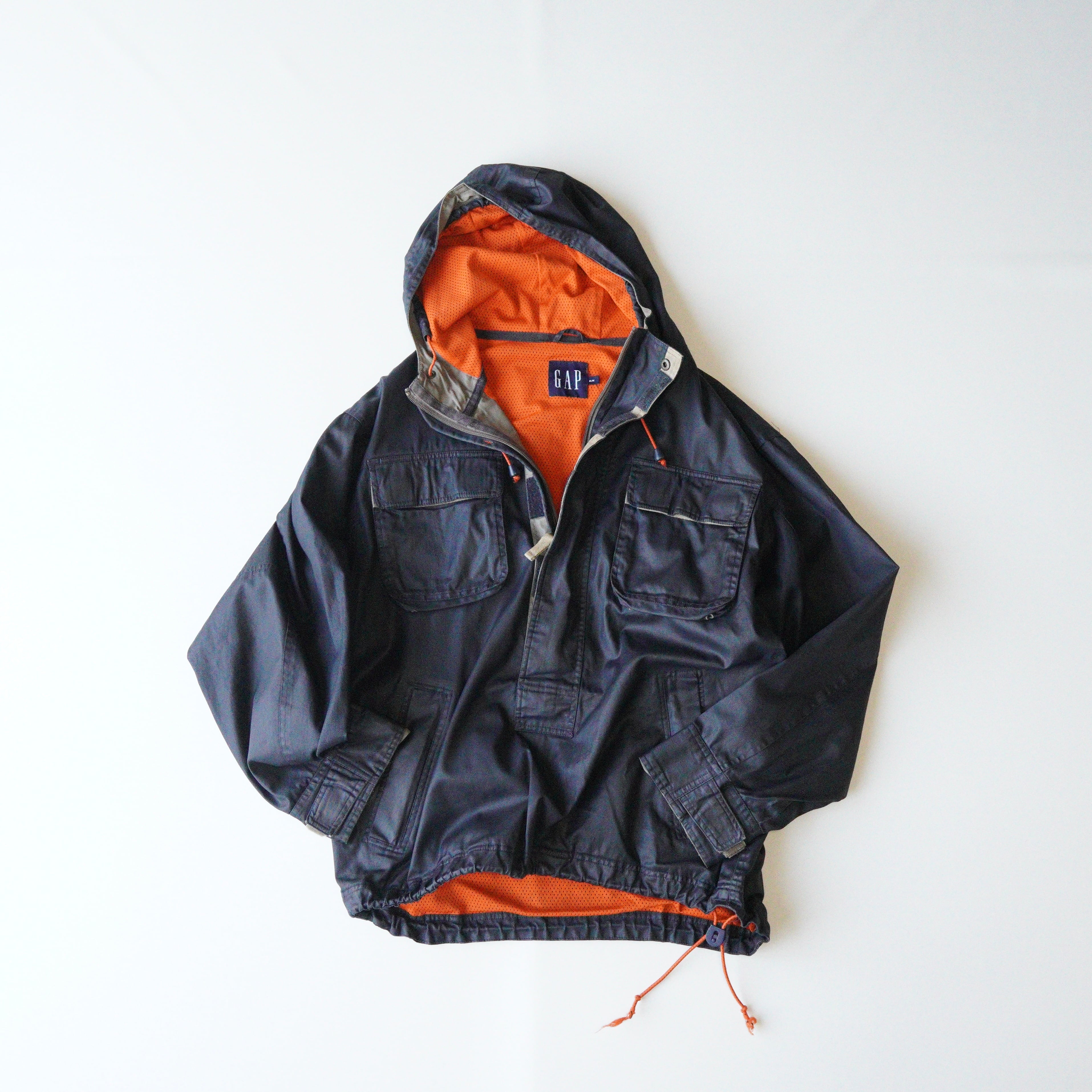 WHAT:"OLD GAP" Anorak jacket ERA:1990's COLOR:NavyとBlackの間 MATERIAL:Nylon?オイルドの様なしっかりとした生地感。光沢感あり。 SIZE:M LENGTH(着丈):74cm SHOULDER(肩幅):58.5cm PIT(身幅):65.5cm SLEEVE(袖丈):60cm CONDITION:フロントに傷あり