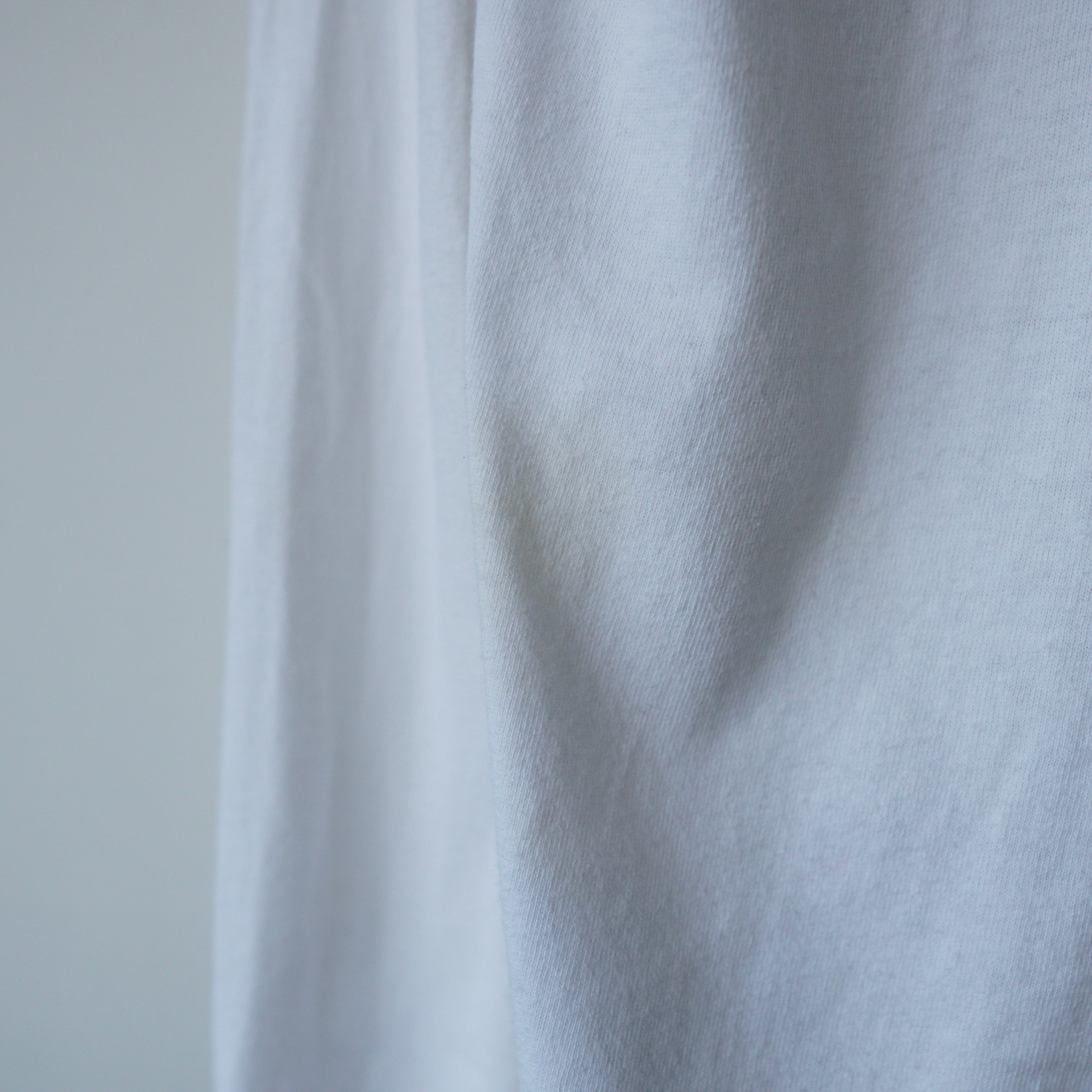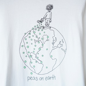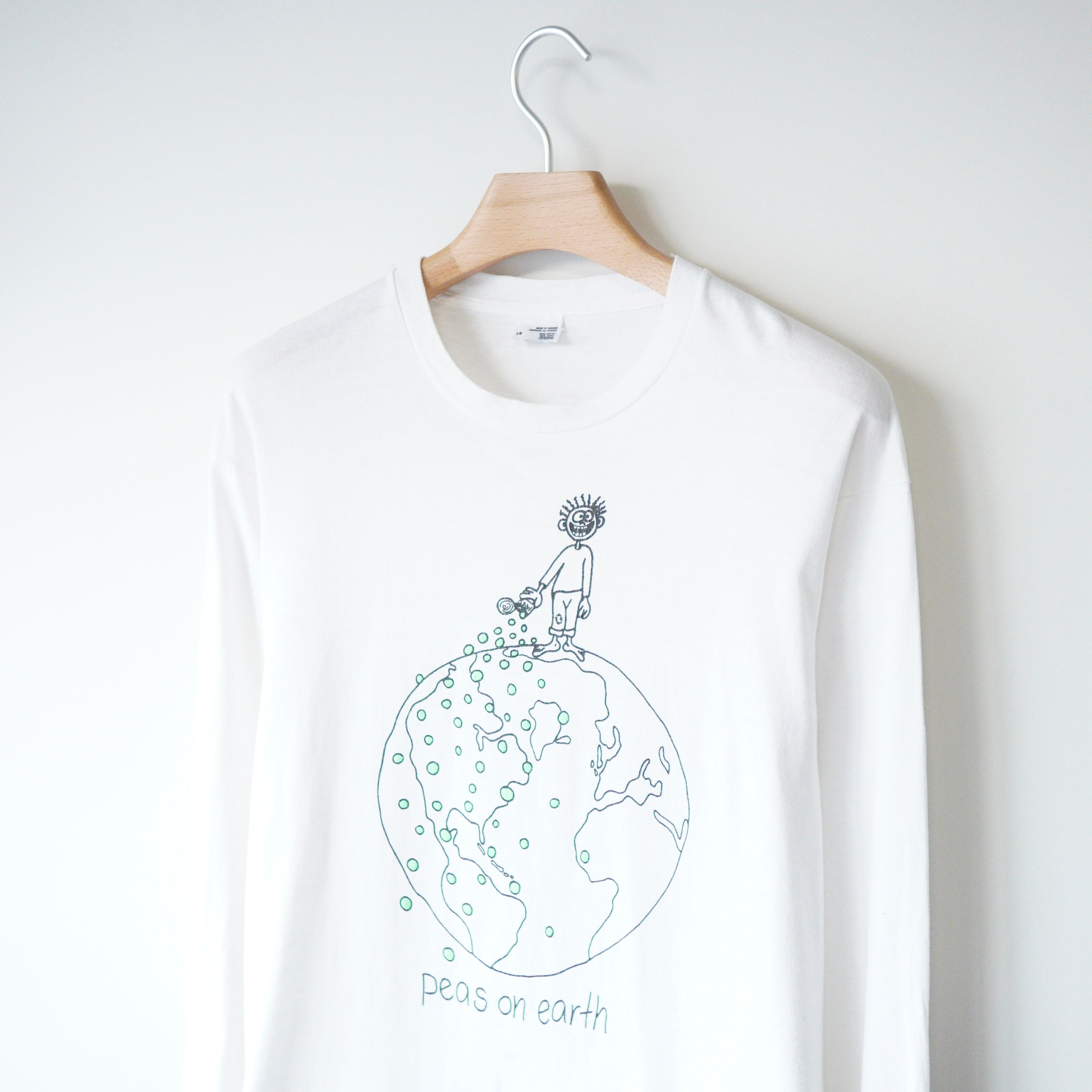 WHAT:"peas on earth" L/S T-shirt BRAND:FRUIT OF THE LOOM ERA:1990's COLOR:White MATERIAL:Cotton100% SIZE:L LENGTH(着丈):76cm SHOULDER(肩幅):54.5cm PIT(身幅):53.5cm SLEEVE(袖丈):69.5cm CONDITION:フォント下、横腹にシミ有