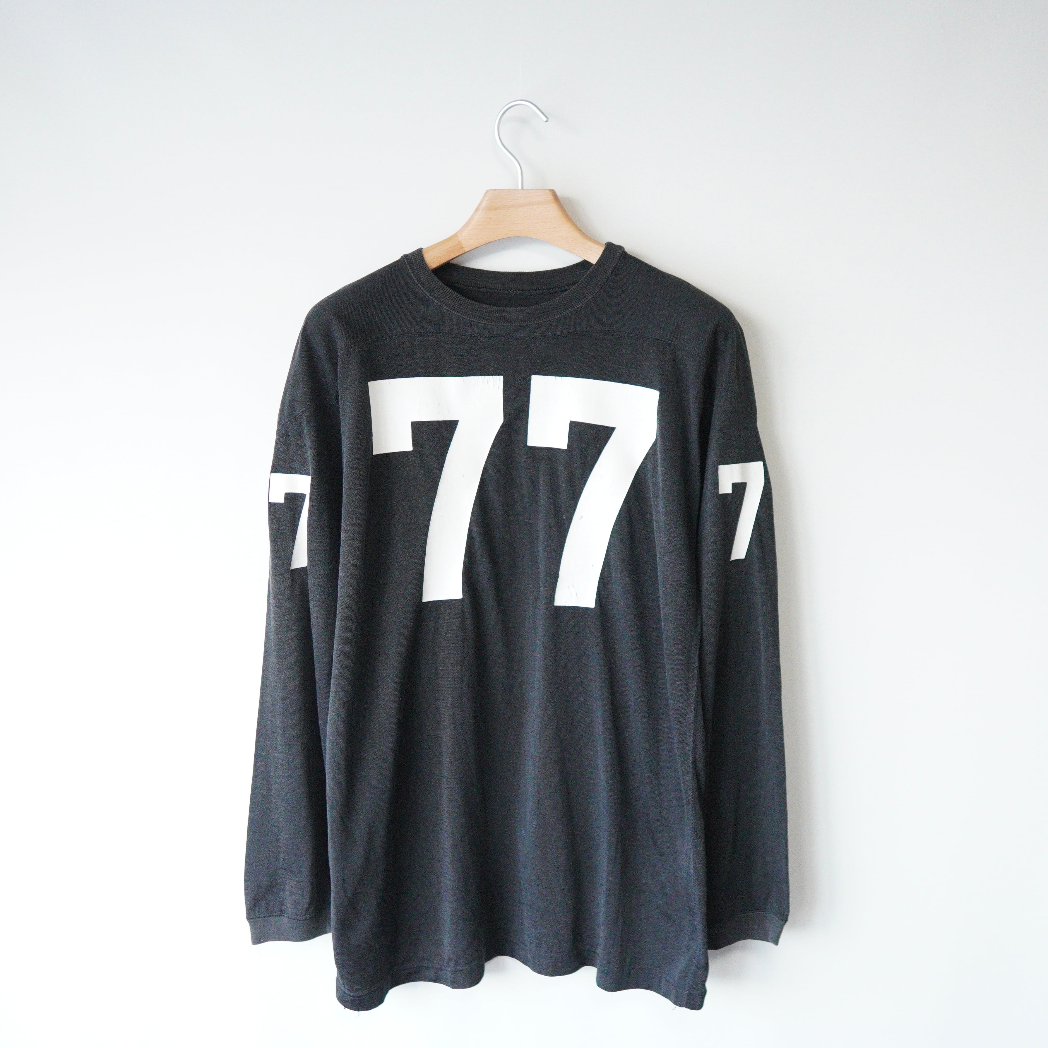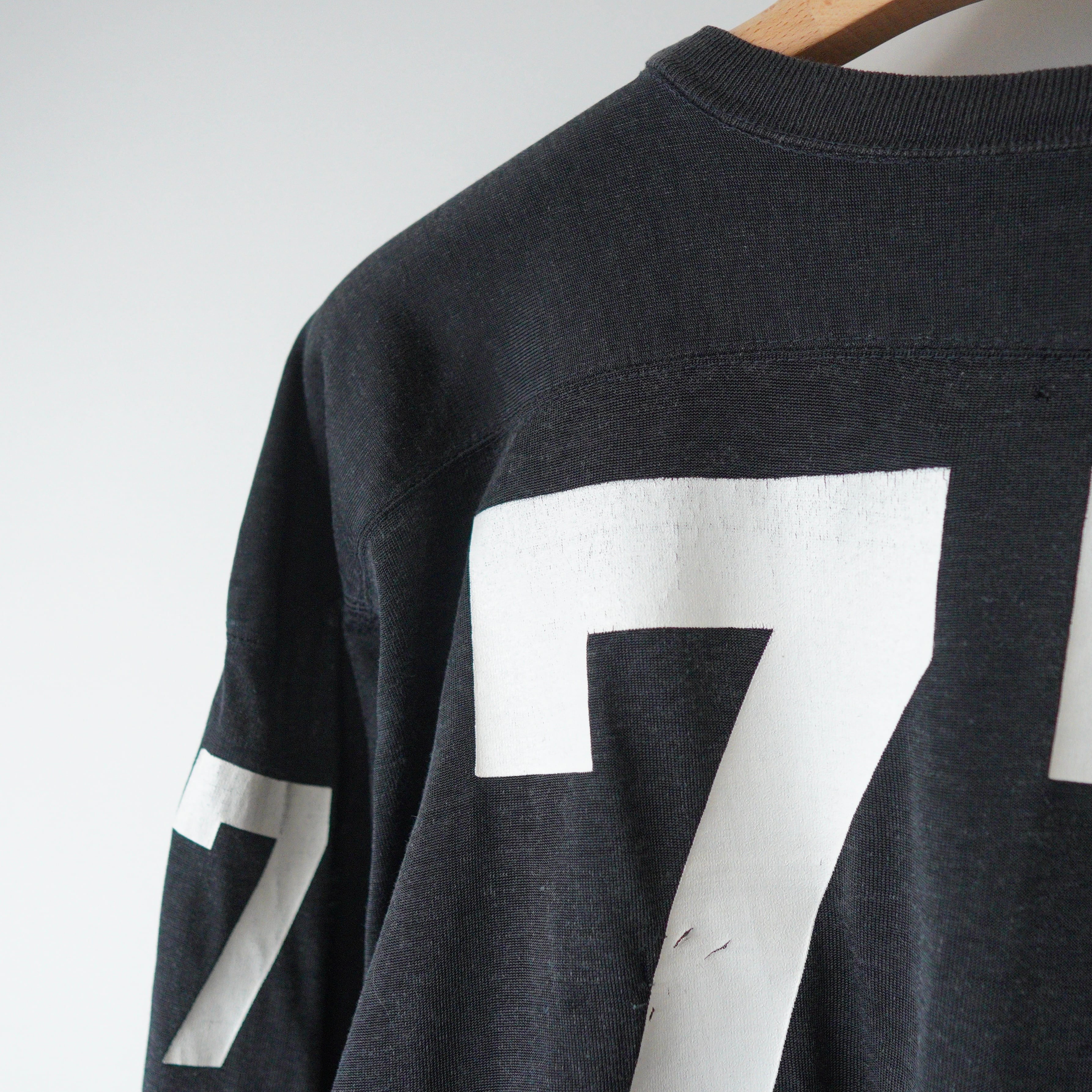 WHAT: "77" Rayon Football shirt ERA:1970s-1980s COLOR:Black MATERIAL:Rayon混だと思われます。 SIZE:XL相当 LENGTH(着丈):81.5cm SHOULDER(肩幅):70.5cm PIT(身幅):59cm SLEEVE(袖丈):58cm CONDITION:比較的状態の良いused商品となります。