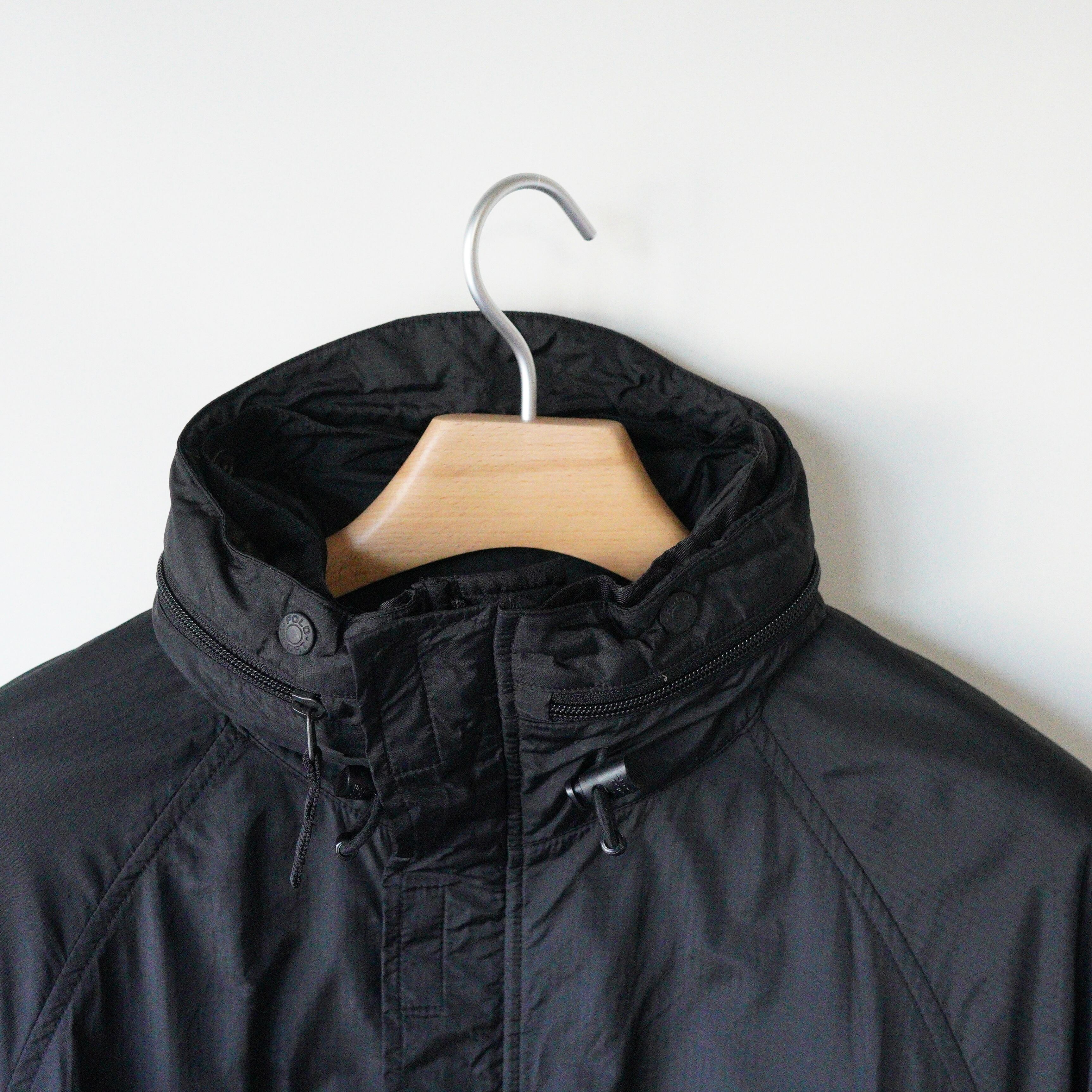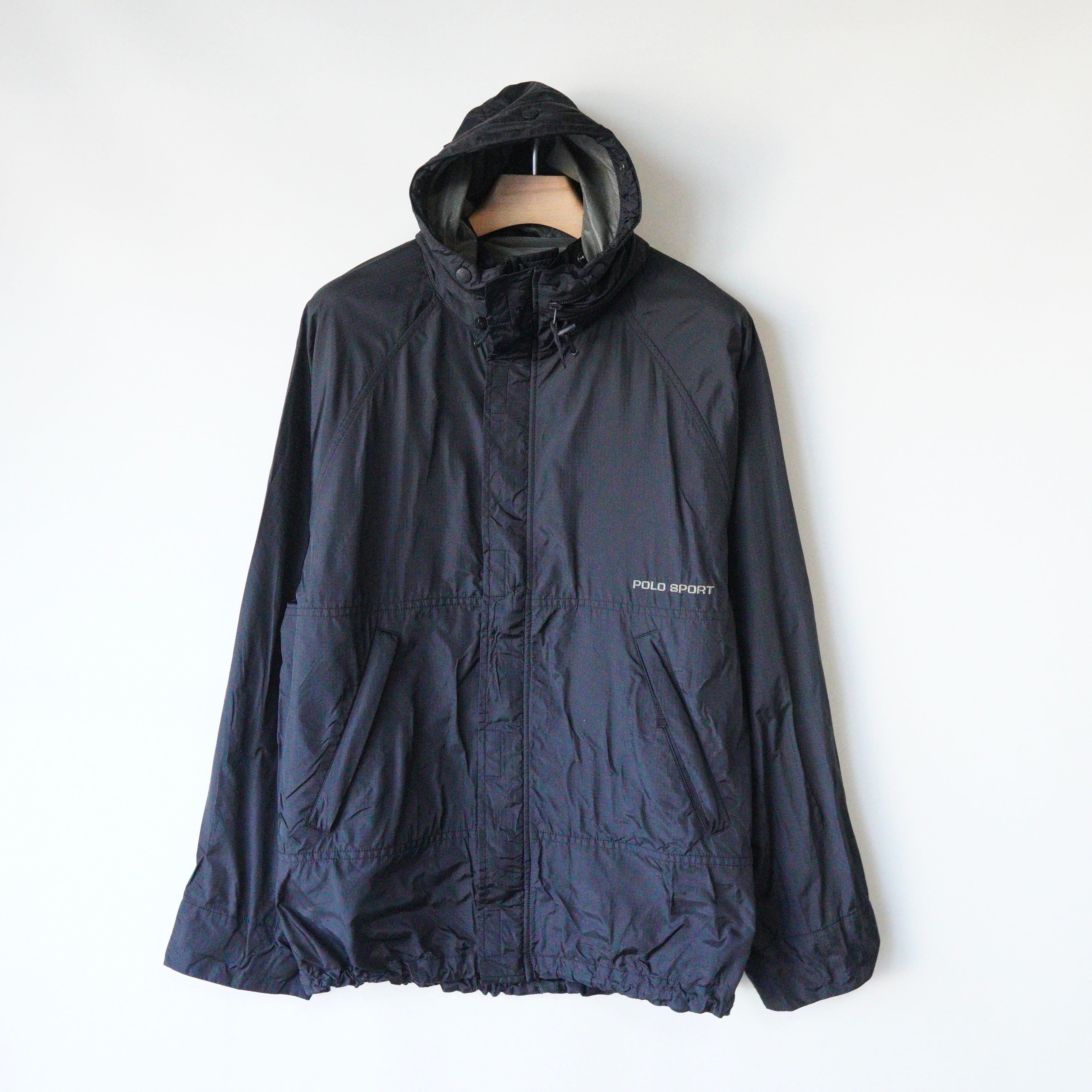 WHAT:"POLO SPORT" nylon jacket ERA:1990's COLOR:Black MATERIAL:Nylon100% SIZE:L LENGTH(着丈):78cm/背面83cm PIT(身幅):64cm SLEEVE(袖丈):83.5cm※ラグラン袖 CONDITION:比較的状態の良いused商品となります。