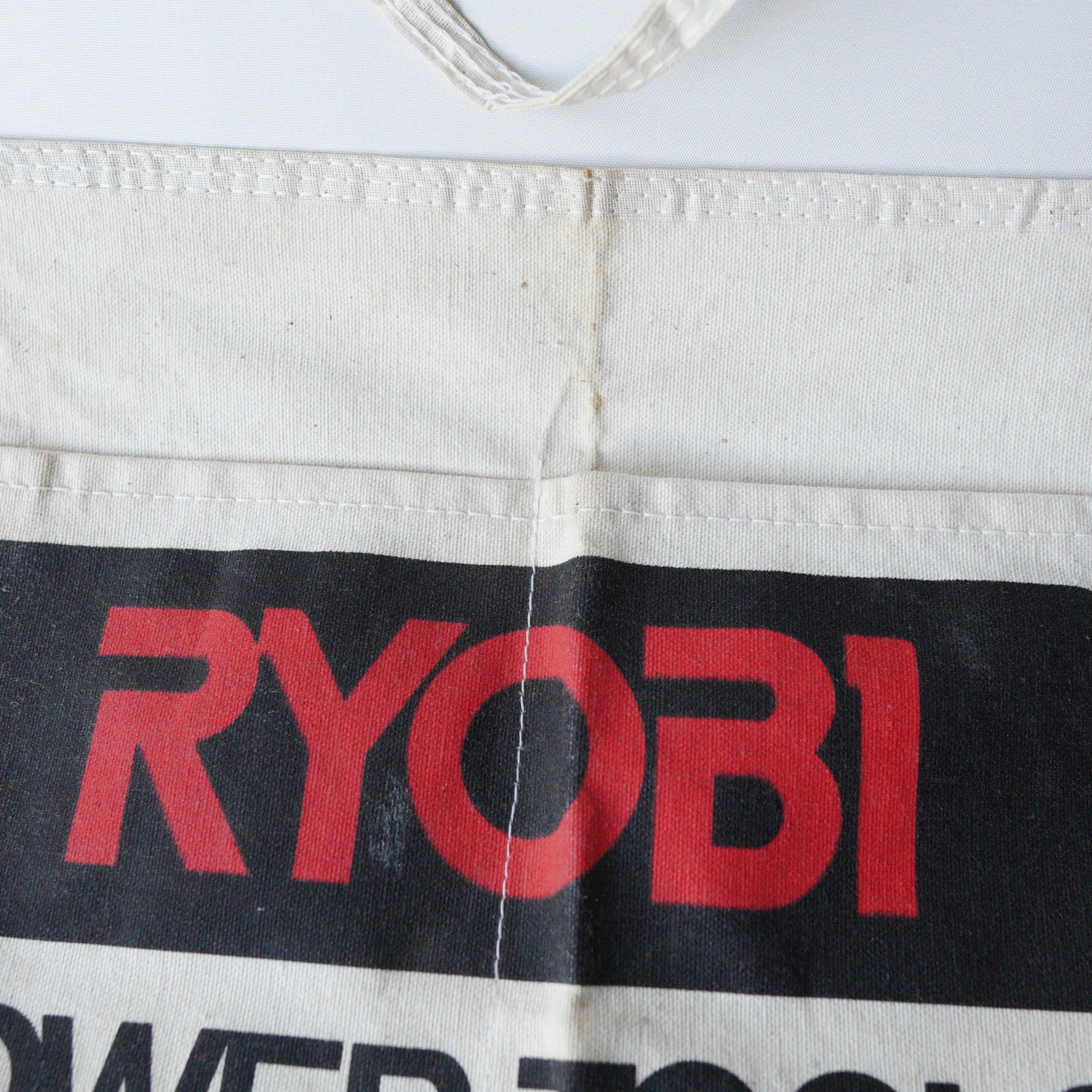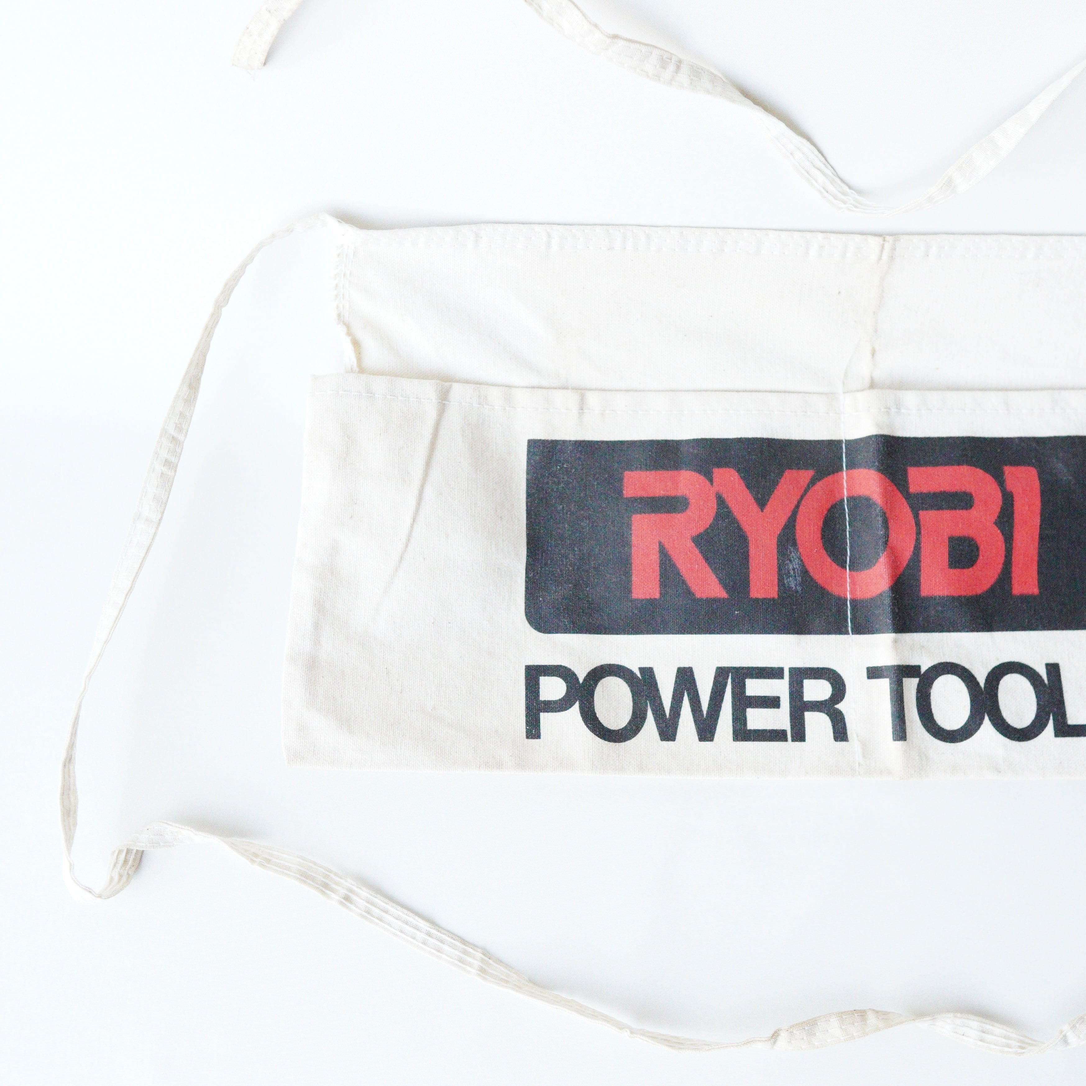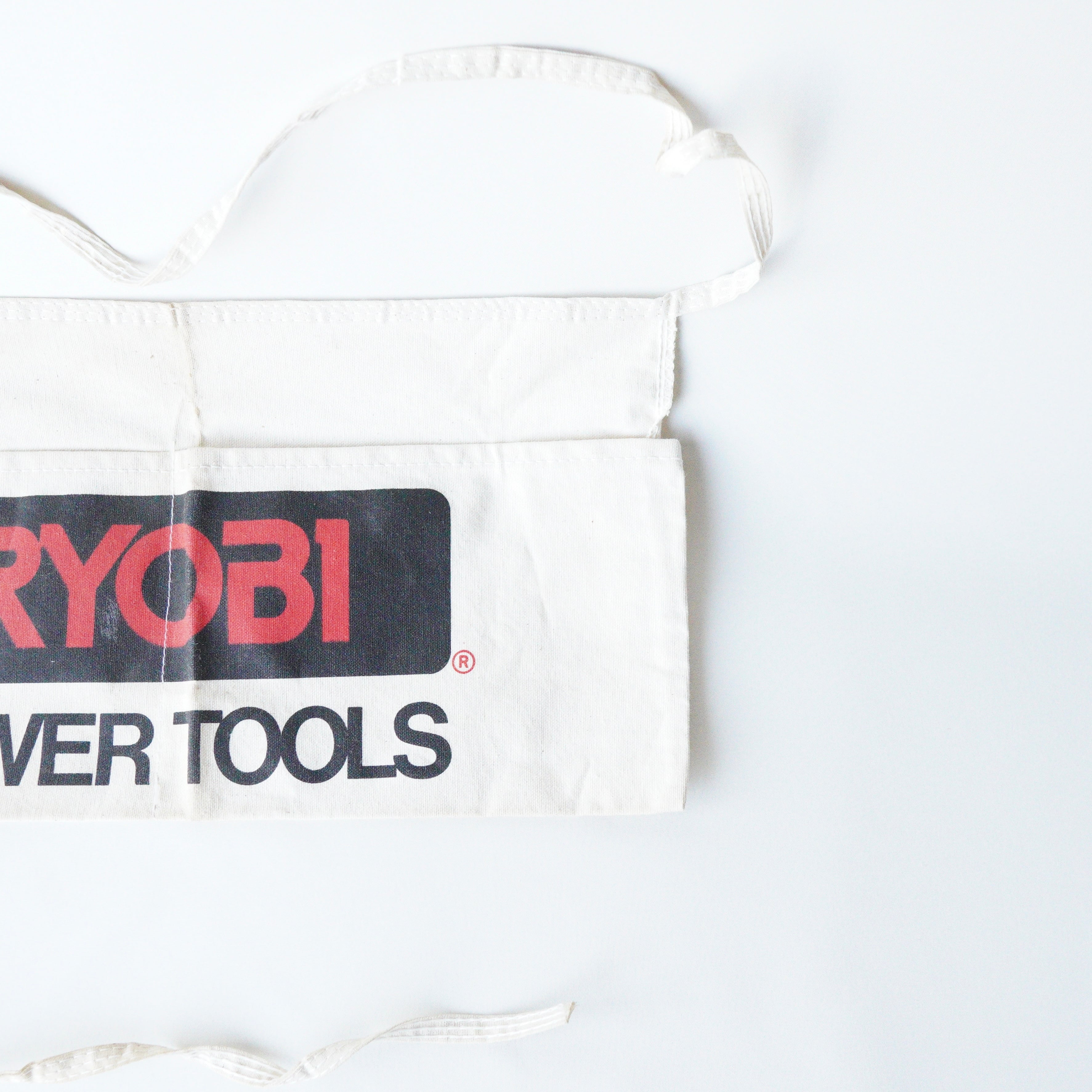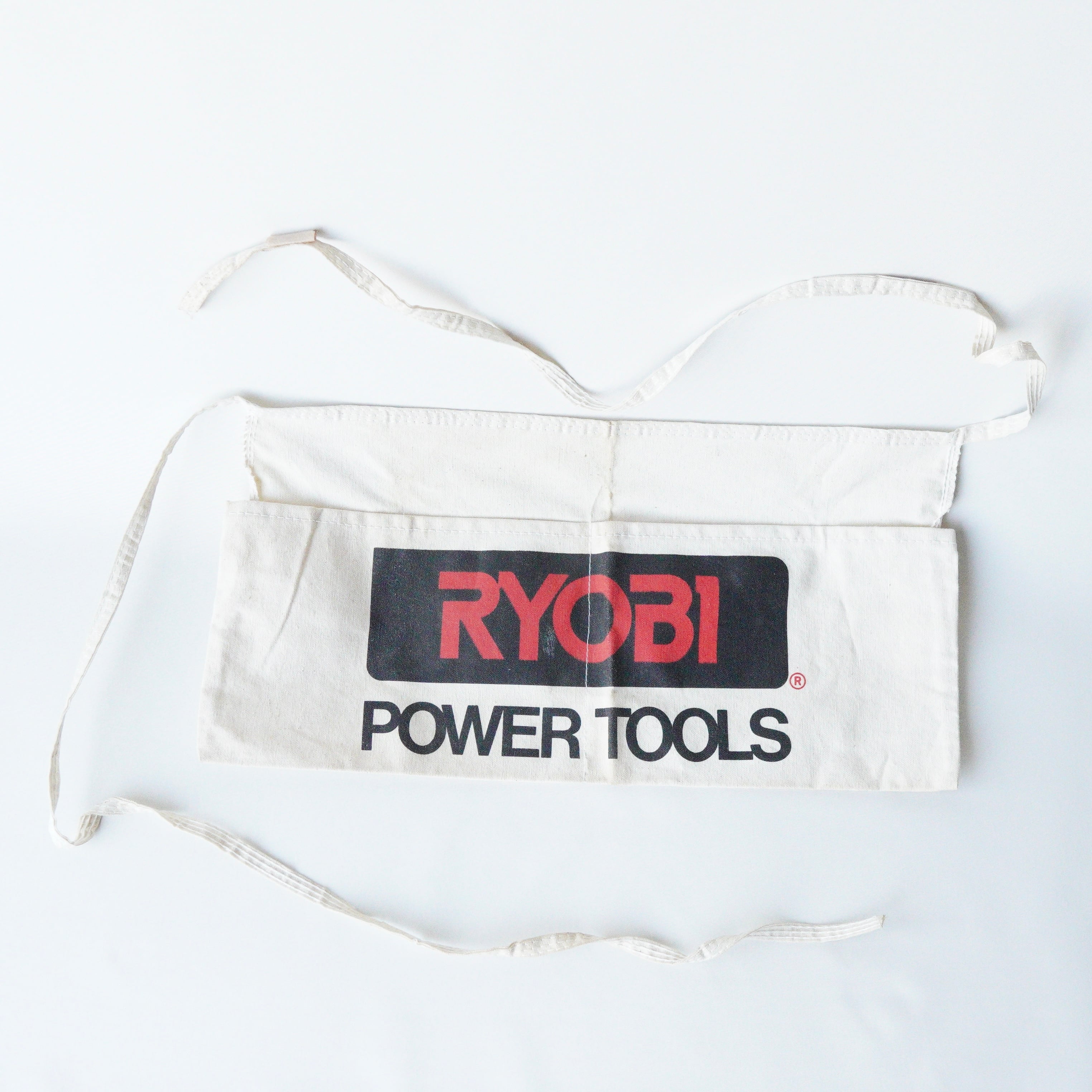 ABOUT/商品説明: "RYOBI" work apron CATEGORY/カテゴリ:Apron WHAT/アイテム種別:ワーク エプロン ERA/年代:1990's COLOR/色:off-white MATERIAL/素材:Cotton100% 縦:22.5cm 横:44cm 全長(紐込み):198cm CONDITION/状態:やや傷や汚れあり DETAIL/ディテール:ツーポケット NOTE/備考:RYOBIは日本発の工具ブランド。アメリカサウスカロライナに拠点置く。